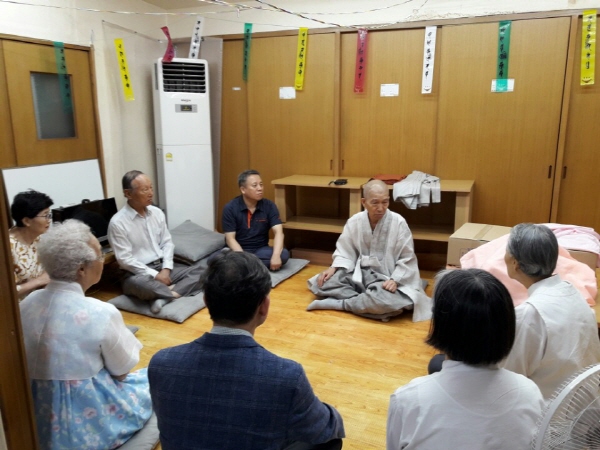 점안식 준비를 마치고 점안식 전 잠시 회원들과 한담을 나누시는 원명스님