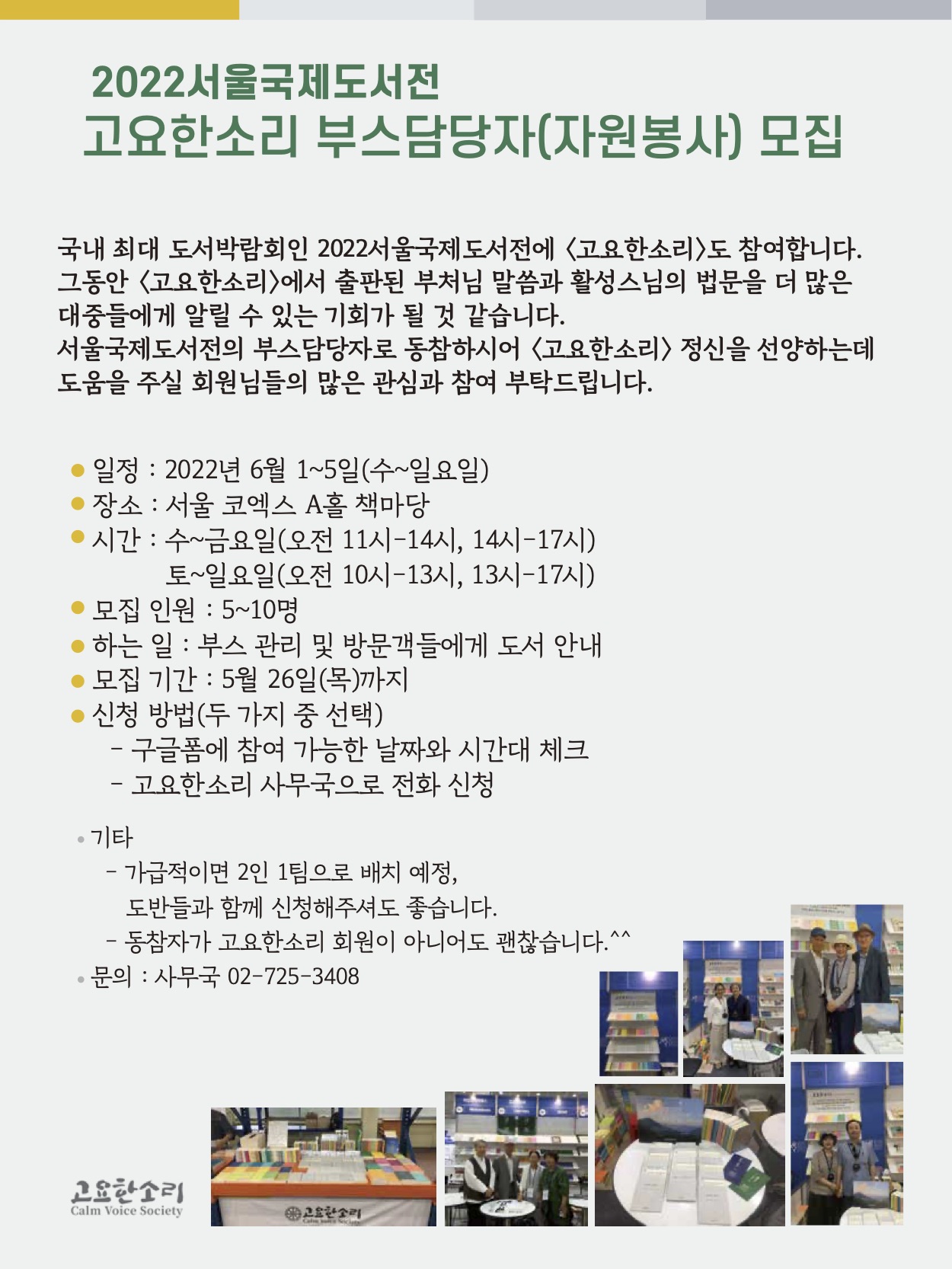<2022 서울국제도서전> 고요한소리 부스담당자(자원봉사) 모집 관리자 2022-05-17 조회수 : 1822 첨부파일: 서울국제도서전 부스담당자 모집.jpg -> 부스담당자(자원봉사) 신청하기 클릭 https://forms.gle/87ozcRkQJNSJjTLR7-> 문의 및 신청 : 사무국 02-725-3408