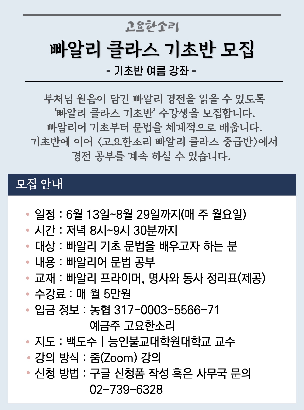 빠알리 클라스 기초반 여름강좌 신청(~6월 13일까지) 관리자 2022-05-26 조회수 : 2207 첨부파일: 기초반 모집.jpg -> 구글폼으로 신청하기 : https://forms.gle/FUppYQzrTFYiH9yb9(클릭)