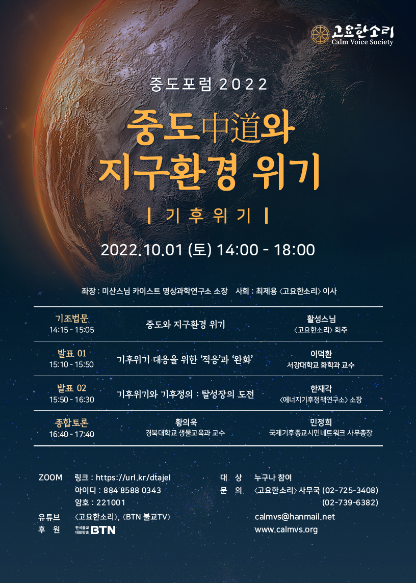 (사)고요한소리(회주 활성스님)는 "중도포럼2022 중도中道와 지구환경 위기"를 개최합니다.