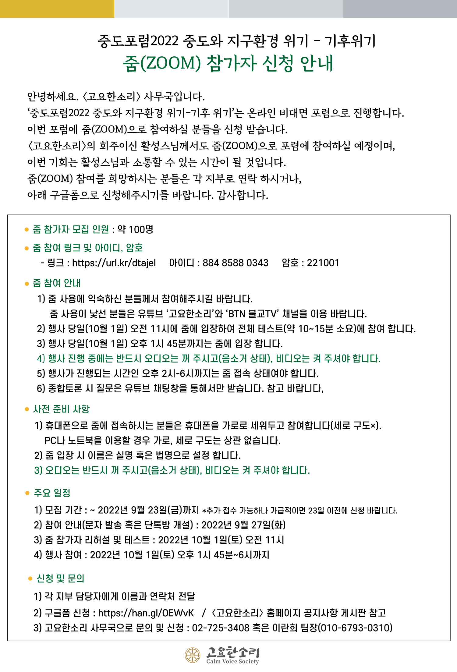 줌 사용이 어려우신 분들은 유튜브 채널 <고요한소리> ,<BTN 불교TV>에 접속하셔서