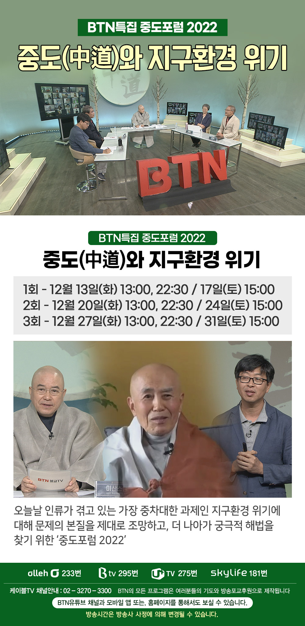 BTN불교TV에 중도포럼2022 '중도中道와 지구환경 위기'가 방영 됩니다.