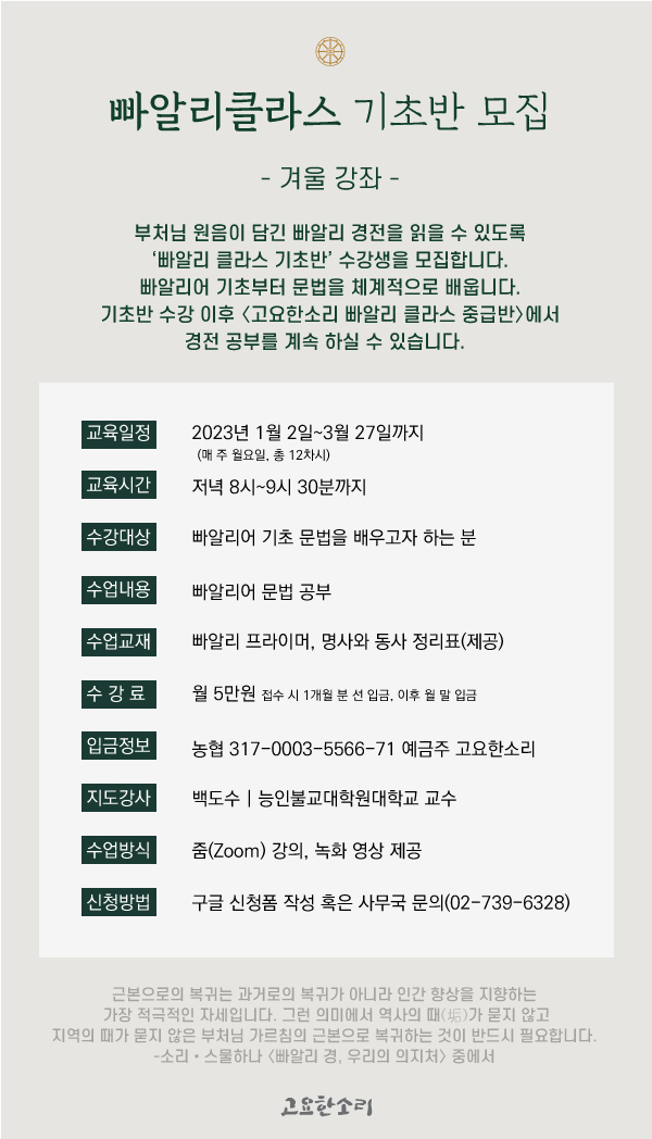 빠알리클라스 기초반 겨울강좌 수강생 모집(~1/1까지) 관리자 2022-12-08 조회수 : 2041 첨부파일: 모집-관련-게시글-웹포스터.jpg >>빠알리 클라스 기초반 신청하기 [클릭]