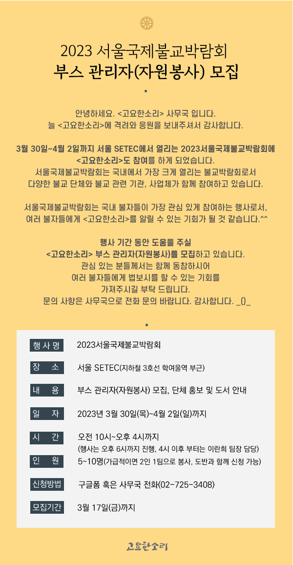 [모집] 2023서울국제불교박람회 부스관리자(~3/17까지) 관리자 2023-03-02 조회수 : 1222 첨부파일: 서울국제불교박람회-모집.jpg ▶ 신청하기[클릭] : https://forms.gle/yuvHTTyAKCZimVR1A