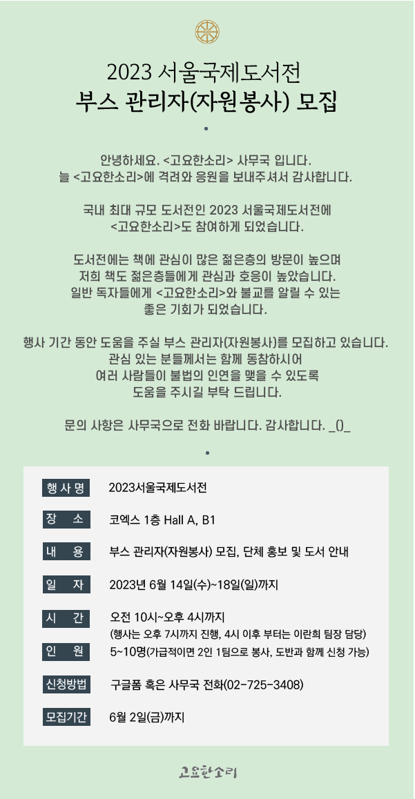 2023서울국제도서전 부스 관리자 모집(~6/8까지) 관리자 2023-05-18 조회수 : 1081 첨부파일: 서울국제도서전 봉사자 모집-100.jpg >>부스 관리자 신청하기 [클릭] https://forms.gle/rQuom2XSMJcp66n6A