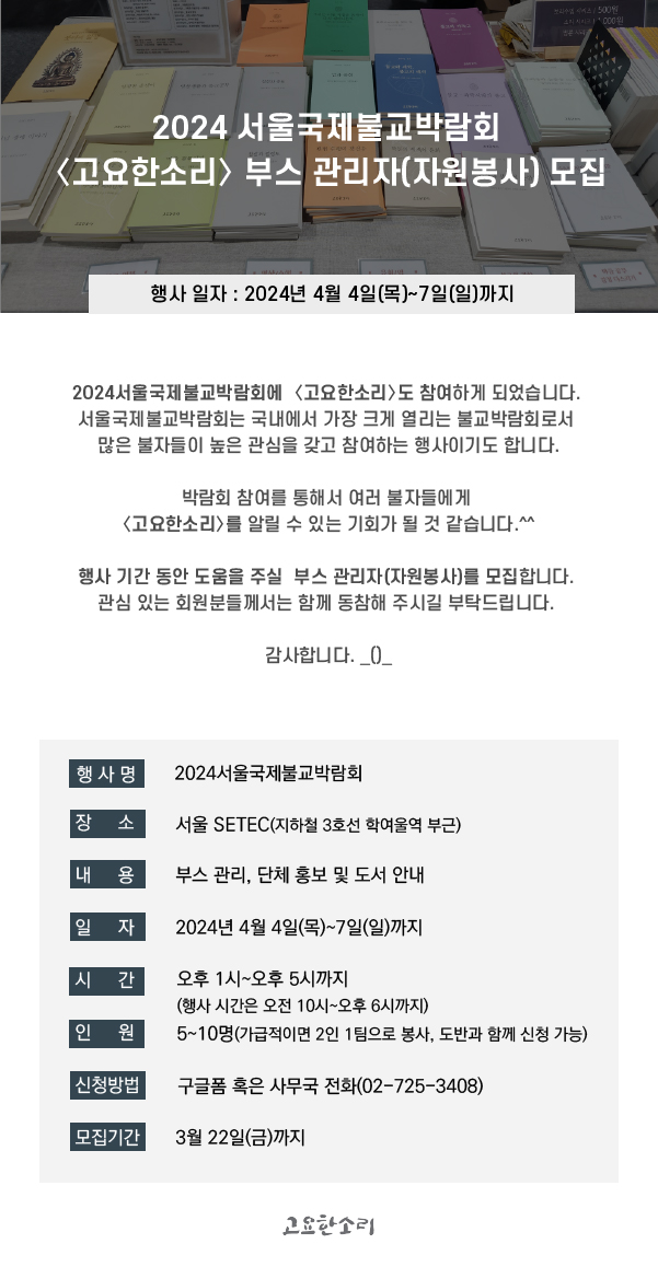 2024서울국제불교박람회 부스 관리자(자원봉사)를 모집합니다. 관리자 2024-03-05 조회수 : 961 첨부파일: 2024 서울국제불교박람회 봉사자 모집-100.jpg 구글폼으로 신청하기 >>> [클릭]