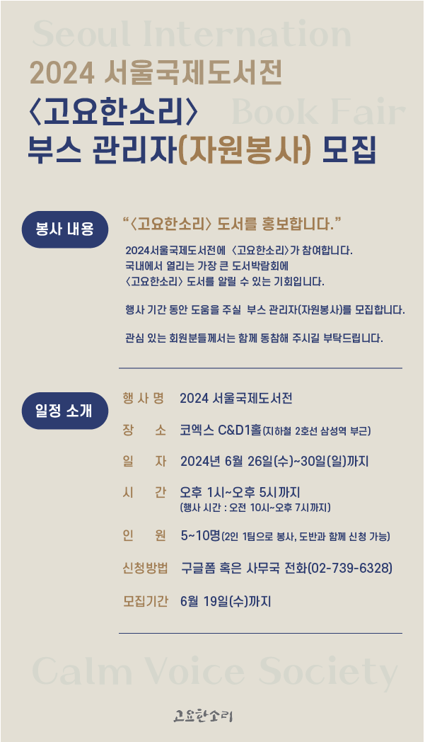 2024 서울국제도서전 부스 관리자(봉사) 모집 관리자 2024-06-04 조회수 : 1114 첨부파일: 2024서울국제도서전 봉사자 모집.png * 2024 서울국제도서전 부스 관리자(봉사) 신청 링크 >> [클릭]