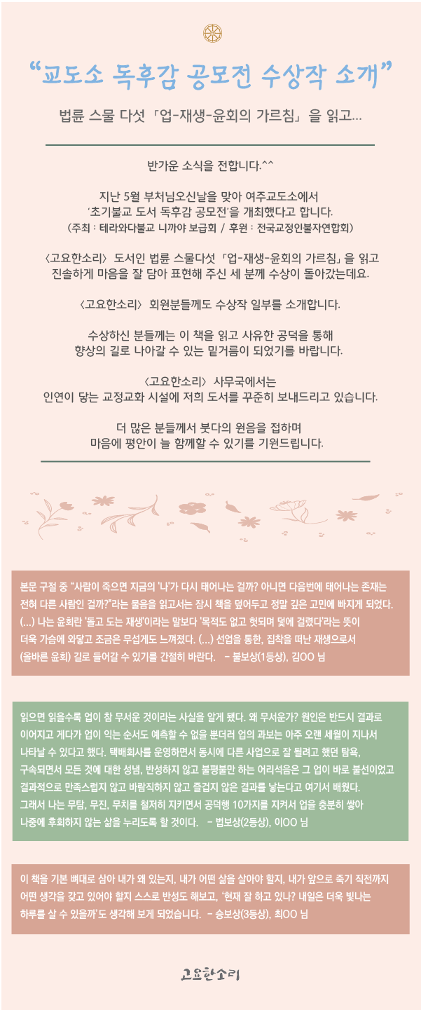 ['업-재생-윤회의 가르침'을 읽고] -교도소 독후감 공모전 수상작 소개 관리자 2024-08-05 조회수 : 1634 첨부파일: 교도소 독후감 수상작(최종).png 1. 교도소 독후감 공모전 수상작 [불보상] 읽어보기 >> [클릭] 2. 교도소 독후감 공모전 수상작 [법보상] 읽어보기 >> [클릭] 3. 교도소 독후감 공모전 수상작 [승보상] 읽어보기 >> [클릭]