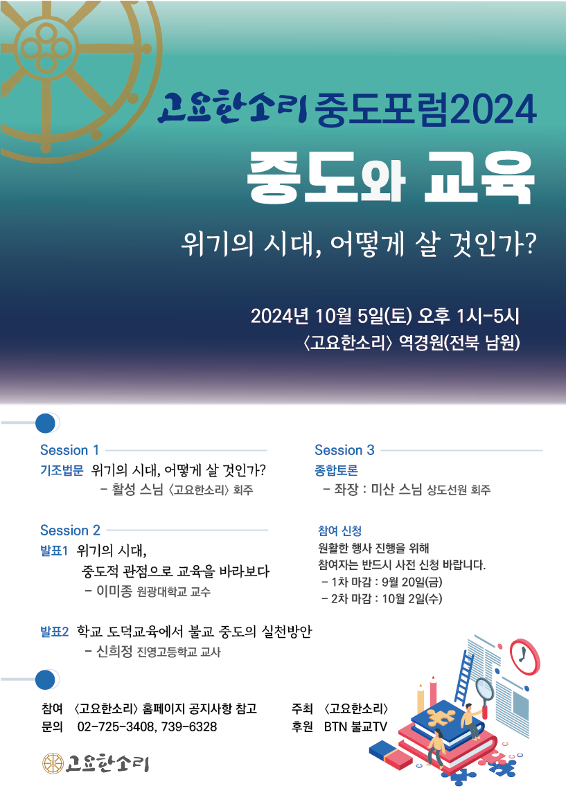 안녕하세요. (사)고요한소리(회주 활성 스님)는 중도포럼 2024 '중도와 교육'을 개최합니다. 이번 중도포럼은 남원 고요한소리 역경원에서 진행합니다. 공양 준비 및 원활한 행사 진행을 위해서 동참하실 분들은 반드시 사전에 참가 신청을 해주셔야 합니다.
