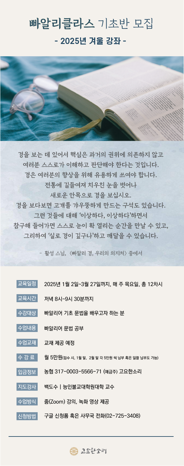 [모집] 빠알리클라스 기초반 겨울강좌(개강일 변경) 관리자 2024-12-11 조회수 : 1015 첨부파일: 빠알리클라스 기초반(2025년 겨울).png ★ 빠알리클라스 기초반 겨울강좌 신청 구글폼 >> [클릭]※ 변동 사항- 내부적인 사정으로 인해서 개강일은 1월 9일(목) 저녁으로 변경되었습니다.- 종강일도 4월 3일(목)로 미뤄진 점, 참고 부탁드립니다.