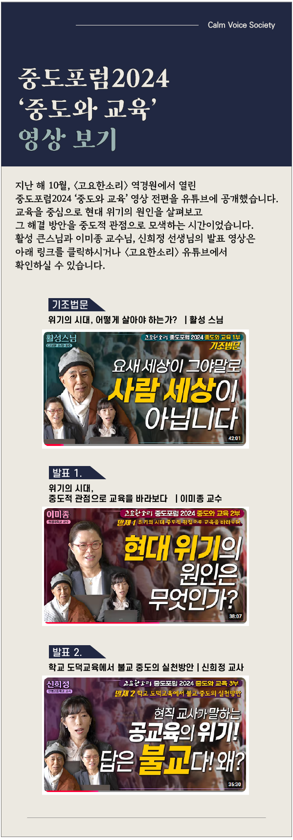 [영상] 중도포럼2024 '중도와 교육' 발표 영상 관리자 2025-01-16 조회수 : 934 첨부파일: 중도포럼2024 유튜브 영상.png ◆ 활성 큰스님 기조법문 영상 바로보기 [클릭]◆ 이미종 교수님 발표 영상 바로보기 [클릭]◆ 신희정 선생님 발표 영상 바로보기 [클릭]