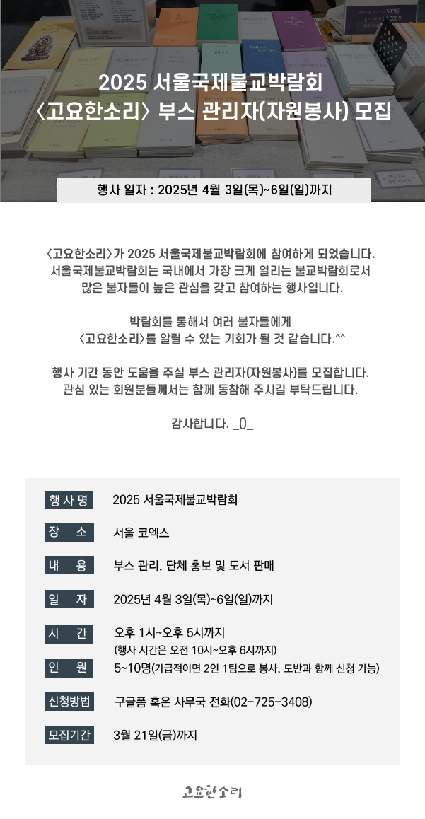 2025 서울국제불교박람회 부스관리자 모집(~3/21) 관리자 2025-02-26 조회수 : 780 첨부파일: 2025 서울국제불교박람회 봉사자 모집.png >>부스관리자(자원봉사) 신청하기 [클릭]