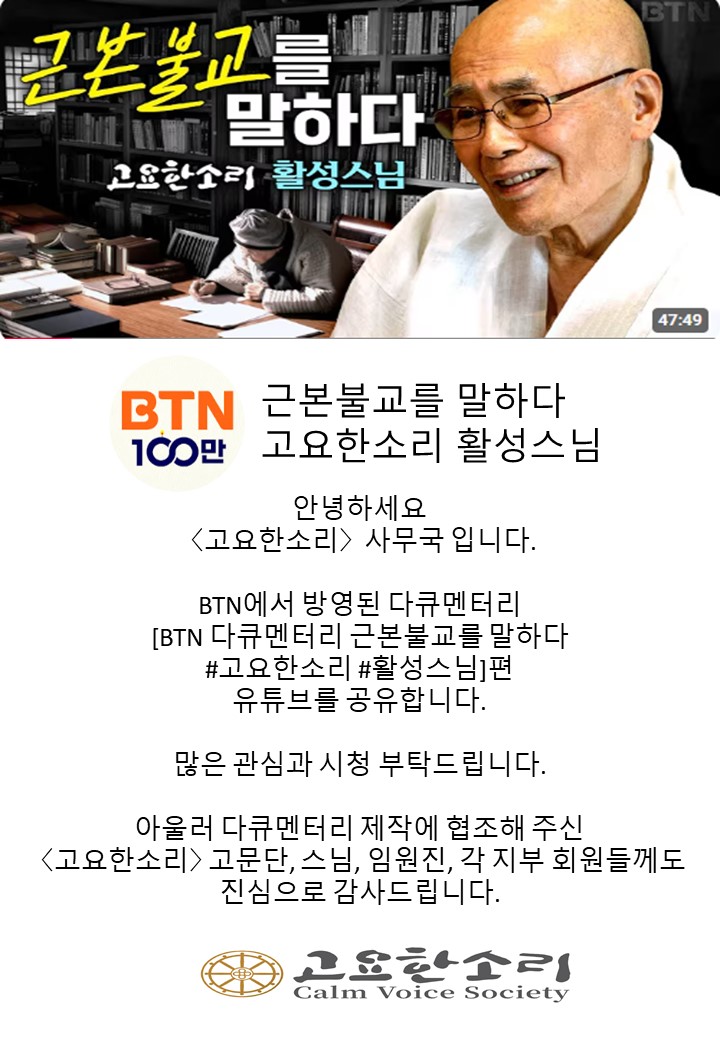[다큐멘터리]근본불교를 말하다 고요한소리 활성스님 관리자 2025-05-02 조회수 : 633 첨부파일: 홈페이지 유튜브 .jpg 다큐멘터리 영상 바로보기[클릭]https://youtu.be/JGuPxDGTf2A?si=MjzuHeKraH_dhv8P