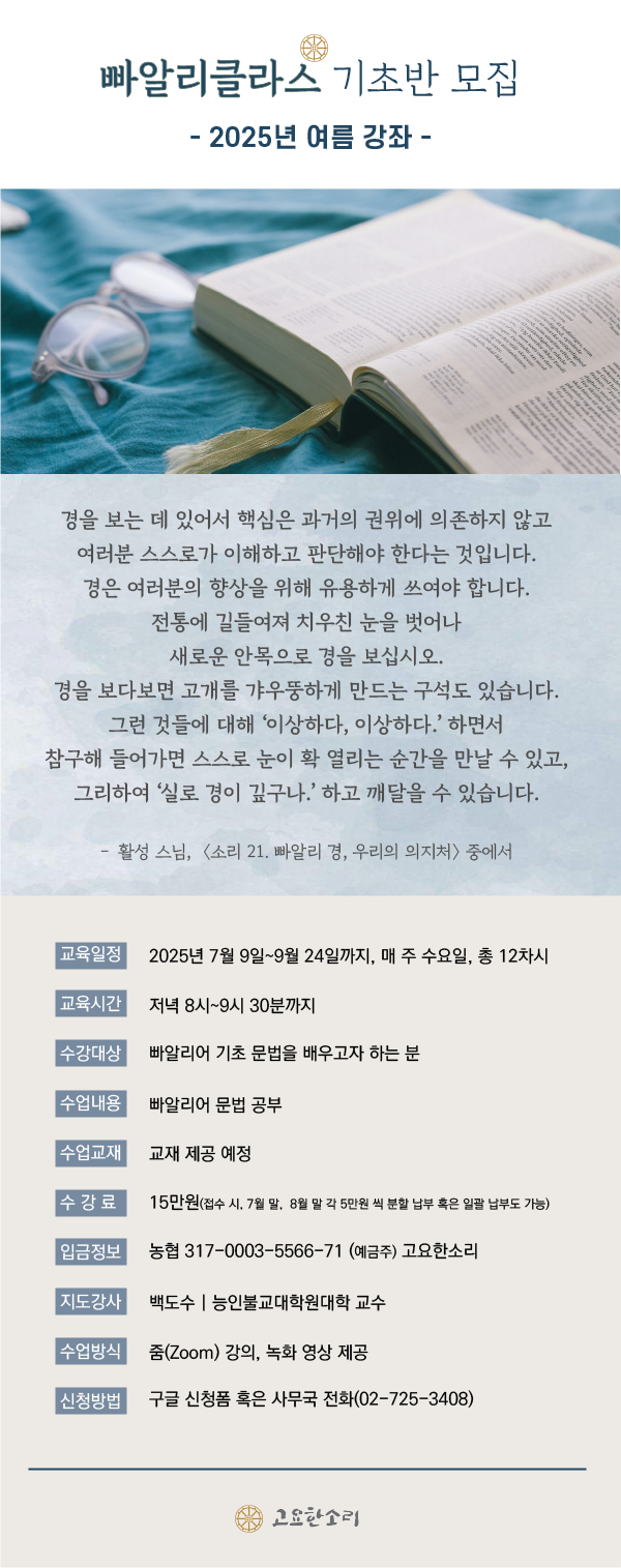 [모집] 빠알리 클라스 기초반 여름강좌 안내(~7/8 모집) 관리자 2025-06-25 조회수 : 1442 첨부파일: 빠알리클라스 기초반(2025년 겨울) 사본.png 구글 신청서 클릭https://forms.gle/ZUUJBrrqUMwL5aeU7