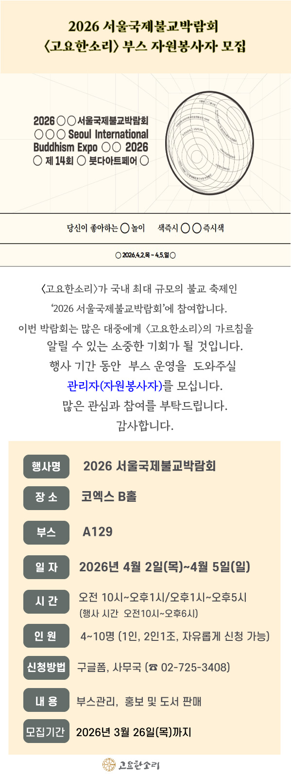 [모집]2026 서울국제불교박람회 부스 관리 자원봉사자 관리자 2026-03-13 조회수 : 892 첨부파일: 6.2026불교박람회-자원봉사자-모집.jpg ☞ 2026 서울국제불교박람회 부스 관리 자원봉사자 신청서 클릭